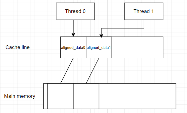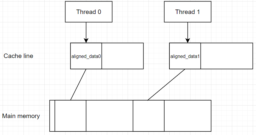 Chúng ta có 2 biến aligned_data0 aligned_data1 có size = 4, mà cache line của mình là 64 bytes, vậy chúng sẽ được sắp xếp như sau: