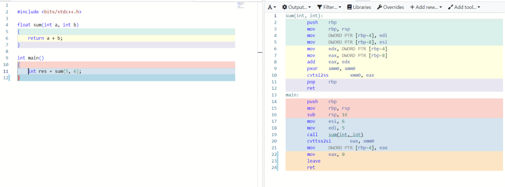 Hãy thử với function bình thường trước nhé, như các bạn thấy bên phải là assembly code, lúc này compiler đã không thể tính toán được output của function mặc dù đã biết trước hai tham số là 5 và 6.