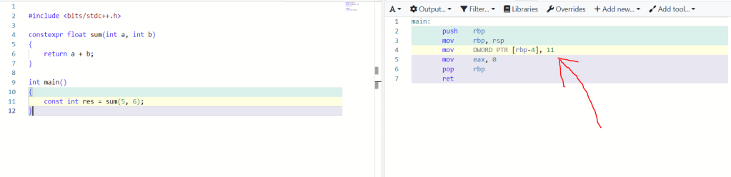 Wow, compiler đã tối ưu rất nhiều, và như mỗi tên mình chỉ, nó đã tính được output của function là 11 ngay tại thời điểm compile-time. Sự khác biệt là đây đúng không nào, giả sử function của chúng phức tạp hơn, có khối lượng tính toán nhiều hơn mà lại được compiler tính ngay tại thời compile thì sẽ cải thiện hiệu năng đáng kể khi runtime.