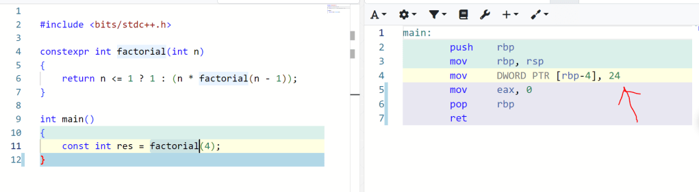 Như các bạn đã biết, một trong những điểm mạnh mẽ của C++ là nó khả năng tối ưu mã nguồn ngay tại thời điểm compile hay còn gọi là compile-time evaluation. Trong quá trình biên dịch, compiler có thể tính toán được output của functions, variables và lưu dưới dạng ngôn ngữ máy (code machine), sau đó khi chạy thì chương trình không cần phải tính toán lại functions đó nữa, điều này rất tiết kiệm thời gian khi runtime, nhưng chỉ áp dụng cho các funtions là pure function (biết trước các argurments tại compile-time, không có đầu vào là reference, không modify bất giá global object nào)