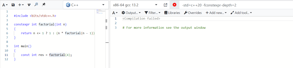 Điều cần chú với recursive function là nó rất dễ xảy ra stack oveflow, vậy nên C++ cũng có giới hạn recursive constexpr calls. Chúng ta có thể điều chỉnh giá trị này bằng cách thay đổi cờ -fconstexpr-depth=2, ví dụ ở đây mình gán depth recursion tại compile time bằng 2 và biên dịch là, thì chương trình trên sẽ lỗi do constexpr calls vượt quá.