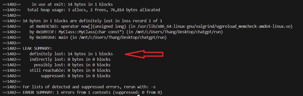 Như các bạn thấy ở phần mũi tên đỏ mình chỉ, chương trình bị leak 14 bytes tương ứng với độ dài dữ liệu mình đã cấp phát.